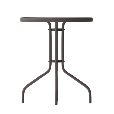 Whether you need to add more seating space or create an intimate conversation area, this versatile round tempered glass top table is up to the task. Enhance the look of your bistro, cafe, restaurant, hotel or home patio space without taking up too much real estate. The ripple designed table top features a smooth surface for keeping items level. A bronze powder coat finish lends the round-shaped table a bold, versatile appearance that matches well with your favorite chairs. Designed for all-weather use, this table is a great option for indoor and outdoor settings. For longevity, care should be taken to protect from long periods of wet weather. Whether you are just starting your business or upgrading your furniture this table is a wise investment.