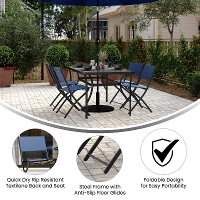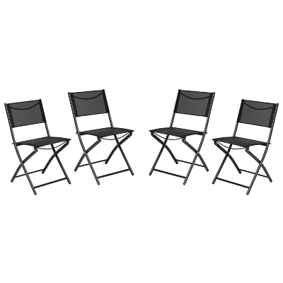 Add stylish seating to your outdoor space with this set of four commercial grade outdoor folding chairs with flex comfort material. Cherish in the comfort of the breathable and rip-resistant mesh fabric seats and backs while taking in a day in the sun. These chairs are incredibly versatile, perfect for your patio, porch, backyard, poolside area, or deck in addition to being commercial grade, making them great for any outdoor bar, bistro, restaurant, lounge, or café. The stylish textilene pattern will pair perfectly with almost any design scheme. Whether you’re looking for a new way to relax or aiming to wow your guests at the next barbecue, these chairs are tough and built for any occasion with a weather and rust-resistant structure that dries quickly. Plus, this set is foldable and portable, making it easy to adjust your area and display your seats wherever you like. Relax confidently with a sturdy steel frame engineered to hold up to 300 lbs. static weight and anti-slip fixed floor glides to prevent damage to your floors. No assembly is required, so you can skip the setup and focus on furnishing your outdoor space. Cleaning is quick and easy, as these chairs can be washed with water and a neutral cleaner. With these chairs at your disposal, you can confidently showcase your style sense and enjoy some well-deserved comfort.