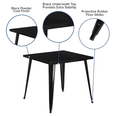 Create a vibrant, energetic dining space with this colorful industrial style black metal table. This lively table will add a retro-modern look to your home or business. Pair this table with like colored metal chairs for a uniform look or mix things up by adding different colored chairs. A thick brace underneath the top adds extra stability. The legs have protective rubber floor glides that prevent damage to flooring. This all-weather table is great for indoor and outdoor settings. For longevity, care should be taken to protect from long periods of wet weather. Great for both commercial and residential spaces, the decorating possibilities for this table are only limited by your imagination!