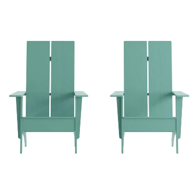 Furnish your lounge space with a fresh new take on a timeless classic with this set of 2 modern style Adirondack style chairs. The streamlined back and arms give this patio chair a sleek profile that will complement any décor. The dual slat back boasts an unusual silhouette of clean, straight lines that look more modern than classic, making it an eye-catching addition to any backyard. Outdoor furniture takes a lot of punishment so durability is key when making a purchase. Constructed of weather-resistant polystyrene, this wood-like substance was designed to hold up in many environments and is strong enough to accommodate users up to 350 pounds static weight. Stainless steel hardware securely fastens this chair together and is weather resistant for long-lasting performance. Unlike traditional wood chairs there is no back breaking sanding, painting, or sealing and this low maintenance porch chair won’t rot, peel, or splinter. Best of all, this adirondack lounge chair can be easily cleaned with water and a neutral detergent. These all-weather adirondack chairs look modern but retain the timeless comfort Adirondack chairs are known for. Pair these chairs with our all-weather poly resin wood adirondack ottoman footrest for total comfort.